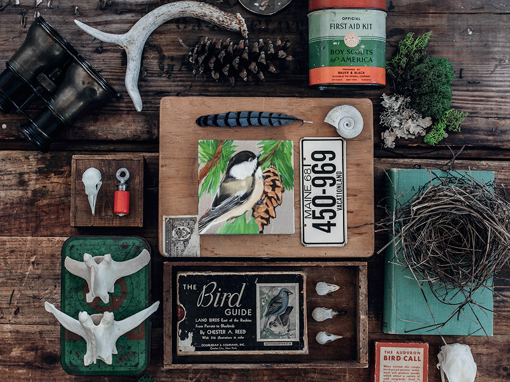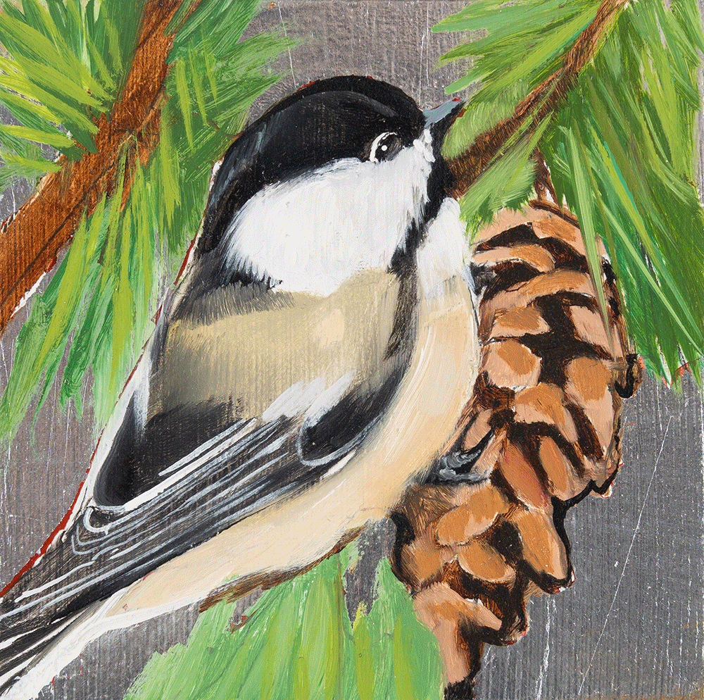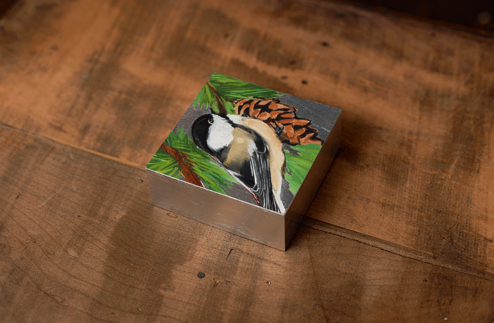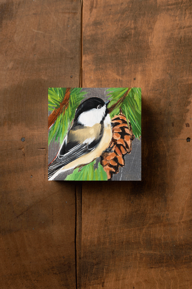 This artwork features the Black Capped Chickadee along with the White Pine Cone & Tassel - the state bird and flower of Maine. Printed on a 4 x 4 x 1.5 inch wood block, these partial reproductions are meticulously matched to the original with archival ink and sealed with a glossy varnish. Each wood block is hand-leafed so that every-one is unique. Your purchase includes a card on the back with the Information about the Bird, Flower, and Artist's Signature.
