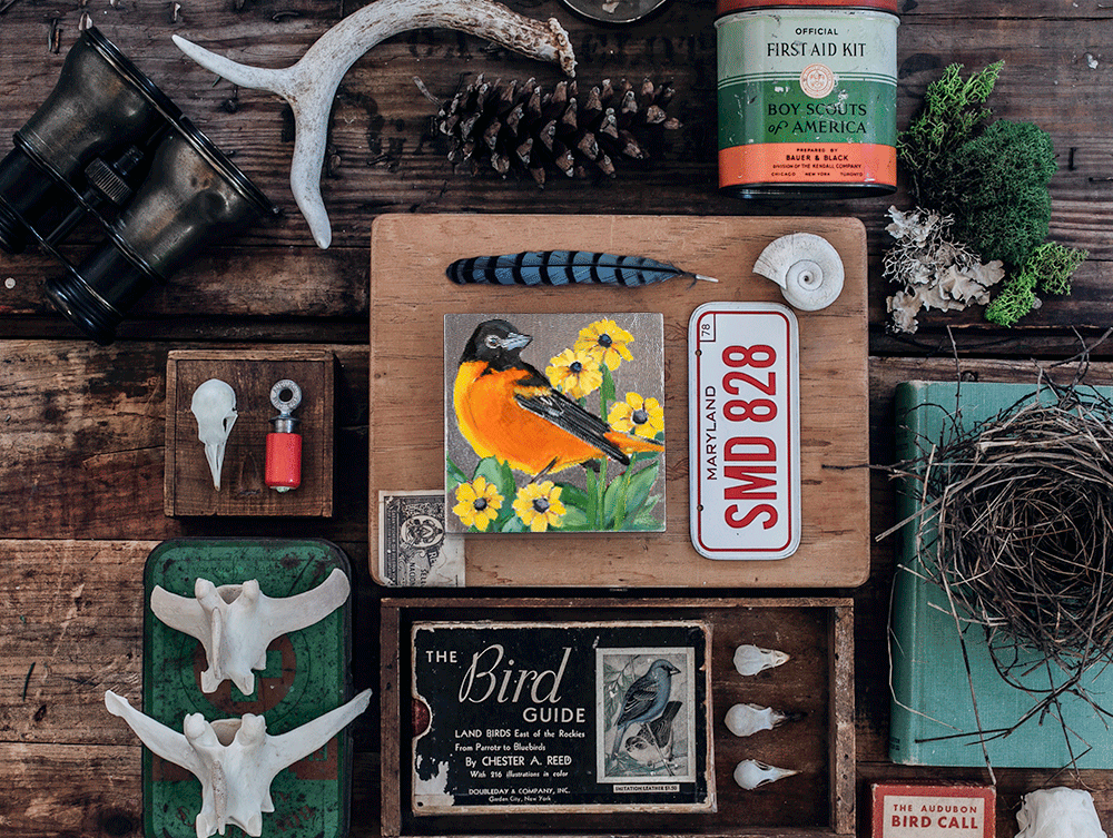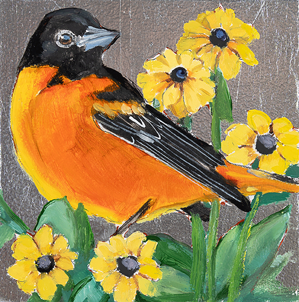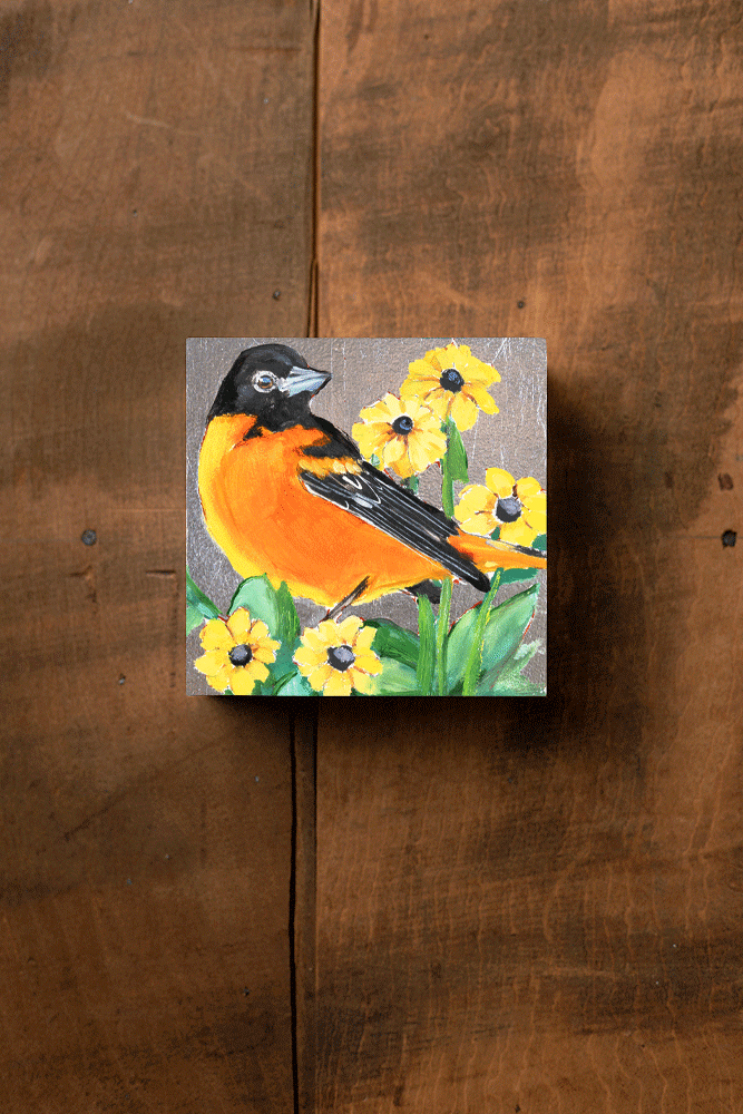 This artwork features the Baltimore Oriole  along with the Black-Eyed Susan - the state bird and flower of Maryland Printed on a 4 x 4 x 1.5 inch wood block, these partial reproductions are meticulously matched to the original with archival ink and sealed with a glossy varnish.  Each wood block is hand-leafed so that every-one is unique. Your purchase includes a card on the back with the Information about the Bird, Flower, and Artist's Signature.