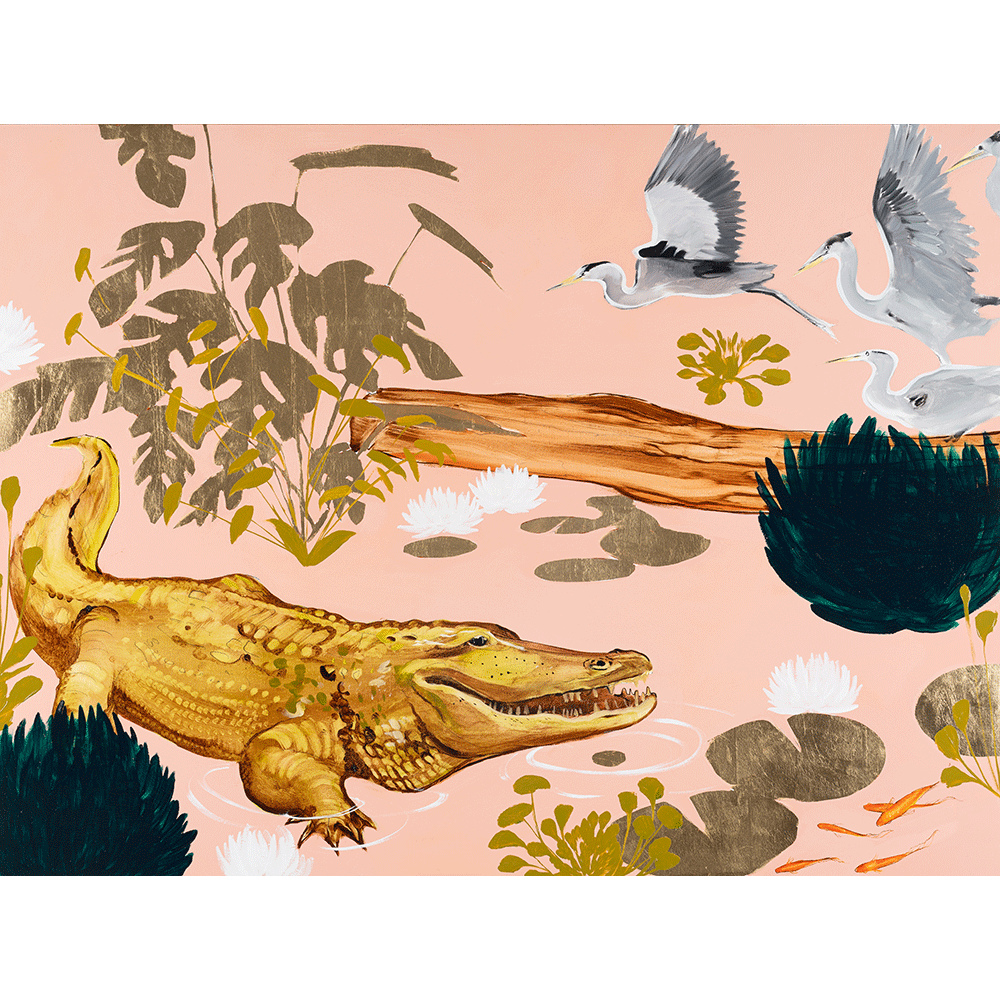 "Gator Pond” Features a Gator in a pond, Herons, and Goldfish with Lily Pads.