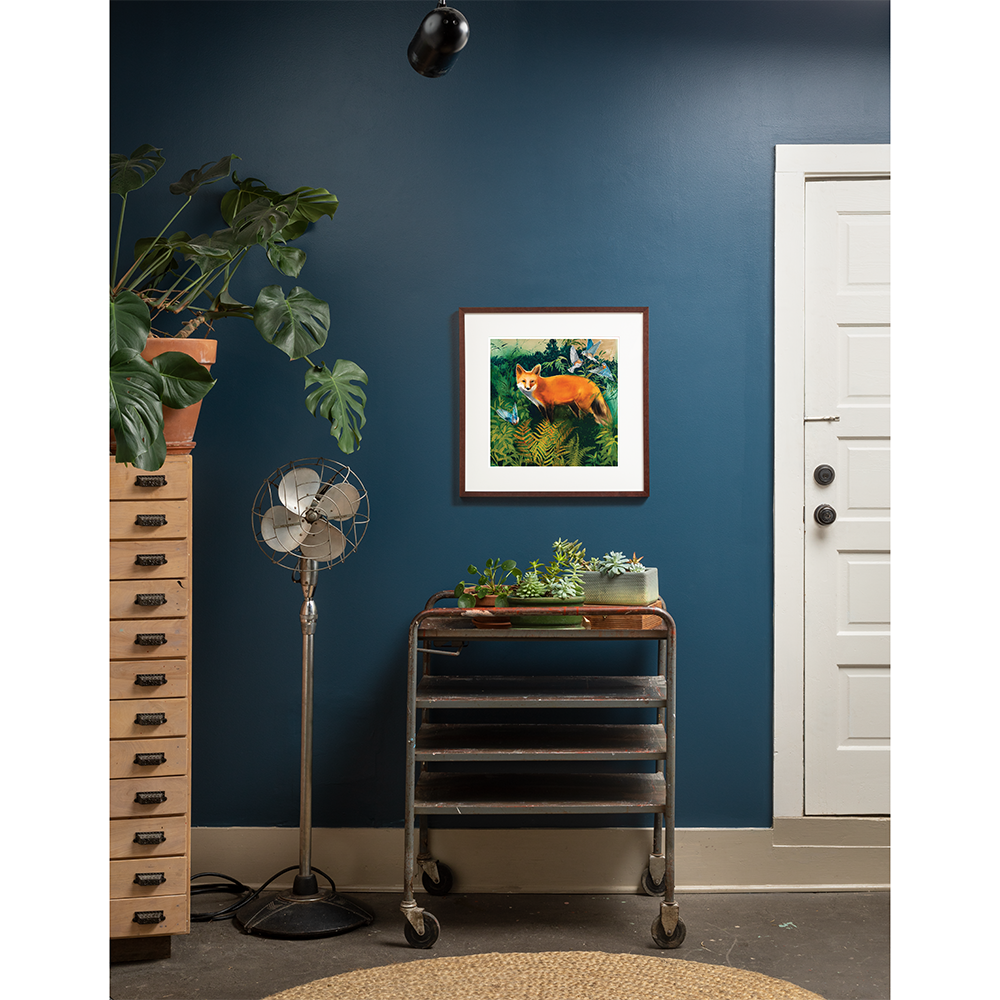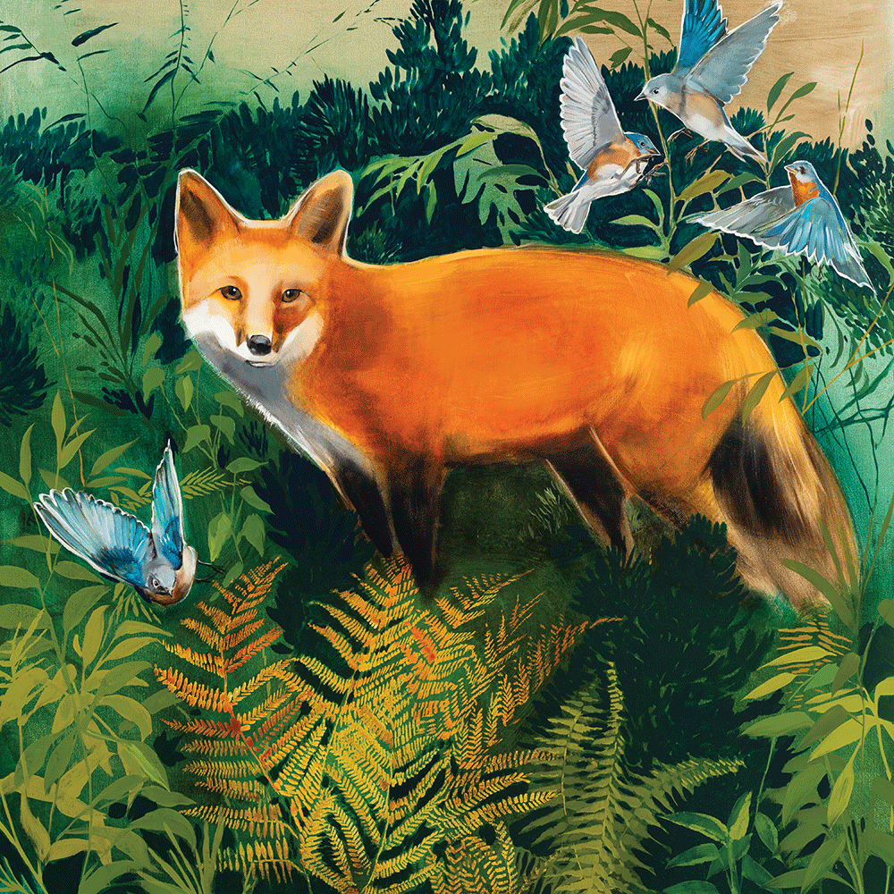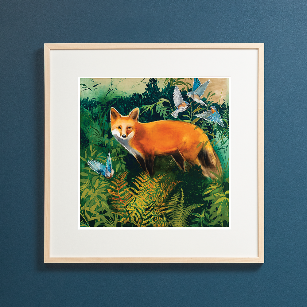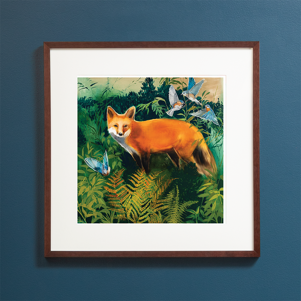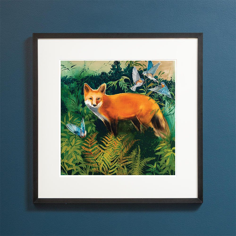 Archival Print of “Deep Woods - Fox and Flight” by Joseph Bradley – Features a Red Fox, Bluebirds, and Ferns. This artwork is printed on fine quality matte paper with beautifully saturated archival inks. Colors are meticulously adjusted to reflect the precise color of the original paintings. This print is hand-signed by the artist and is of a limited edition of 200.