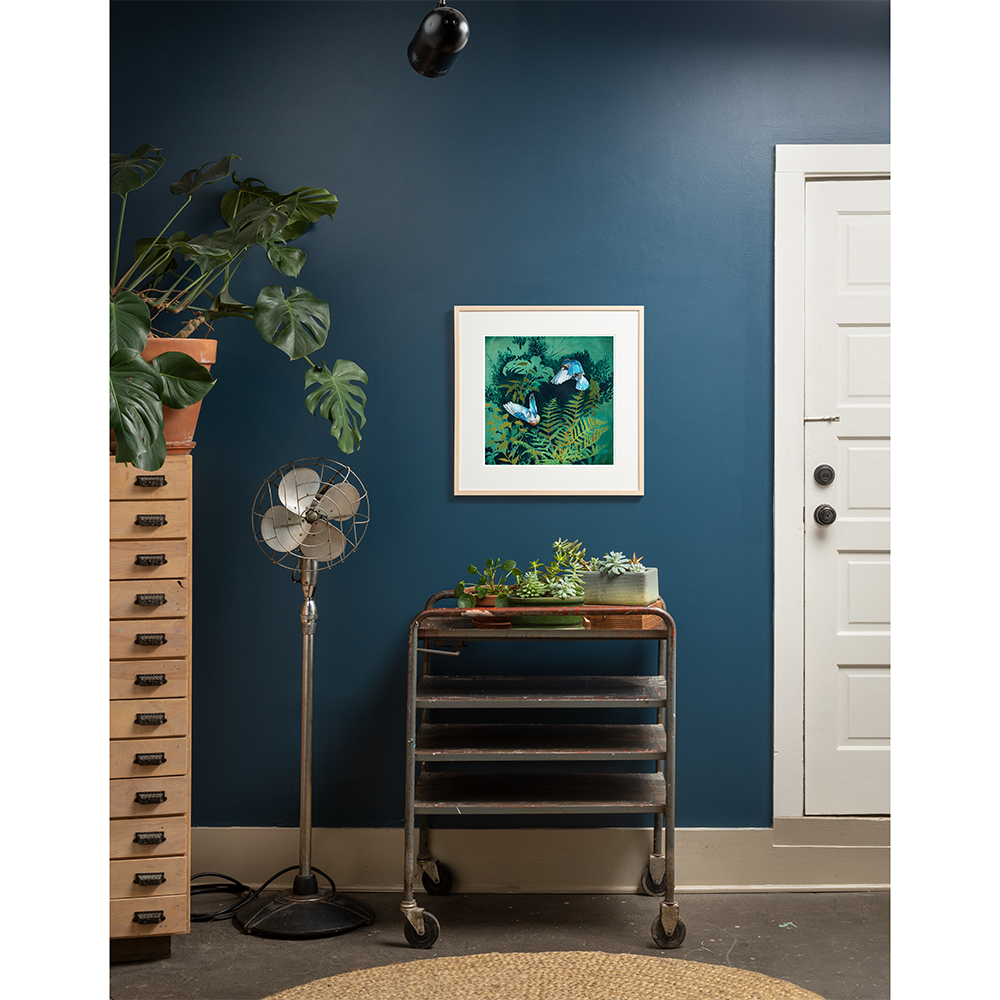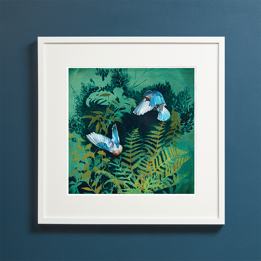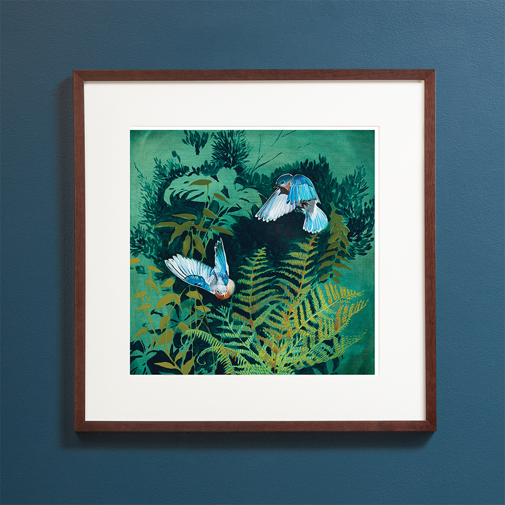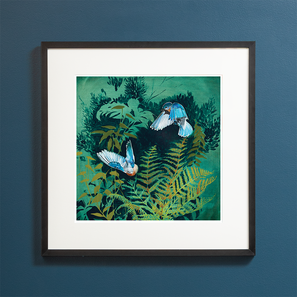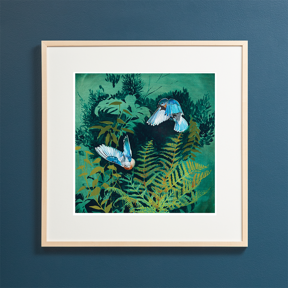 Archival Print of “Deep Woods - Wings” by Joseph Bradley – Features 2 Bluebirds, and Ferns. This artwork is printed on fine quality matte paper with beautifully saturated archival inks. Colors are meticulously adjusted to reflect the precise color of the original paintings. This print is hand-signed by the artist and is of a limited edition of 200.