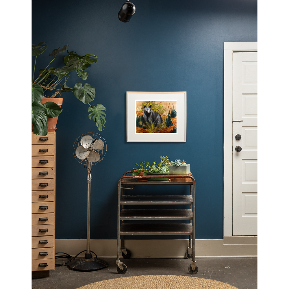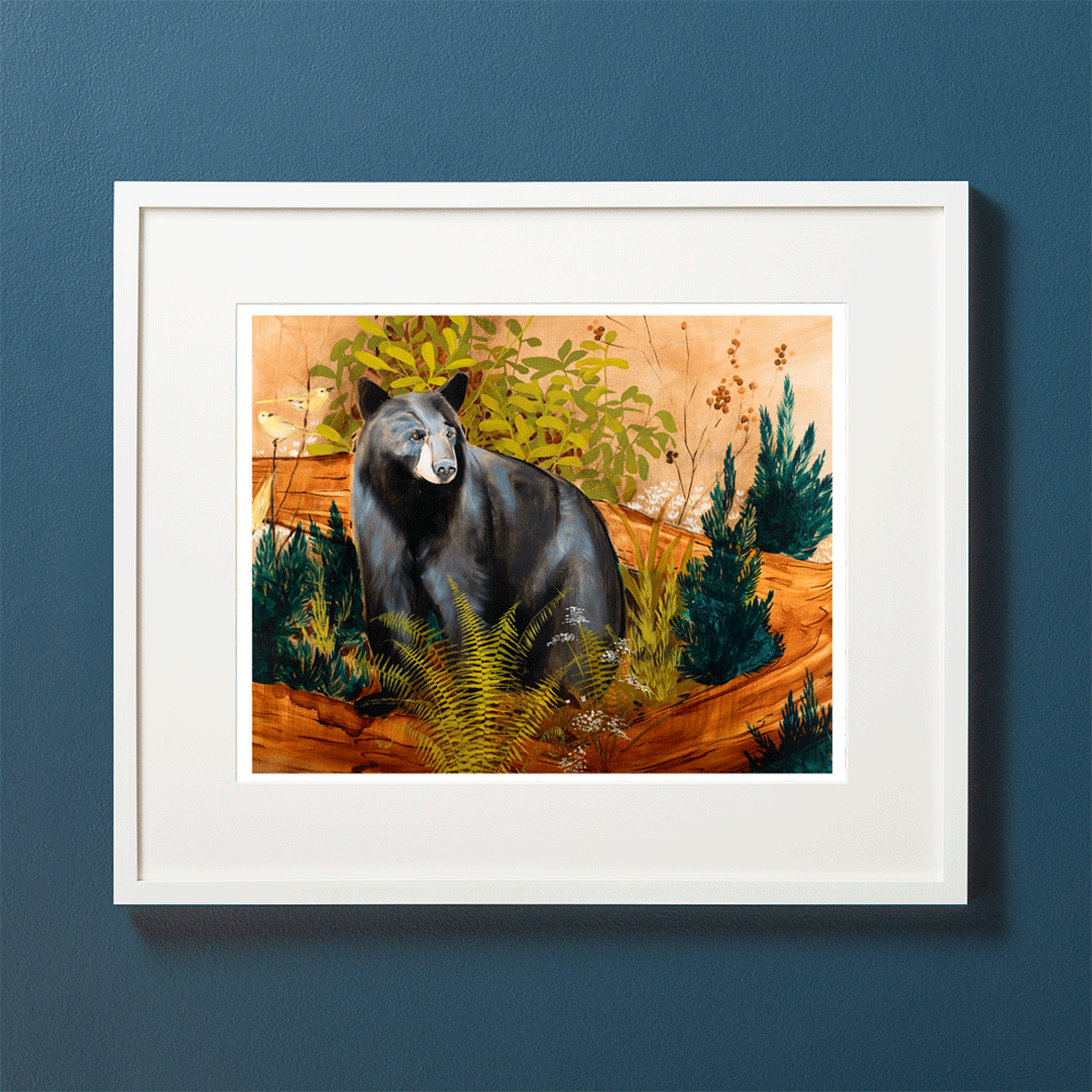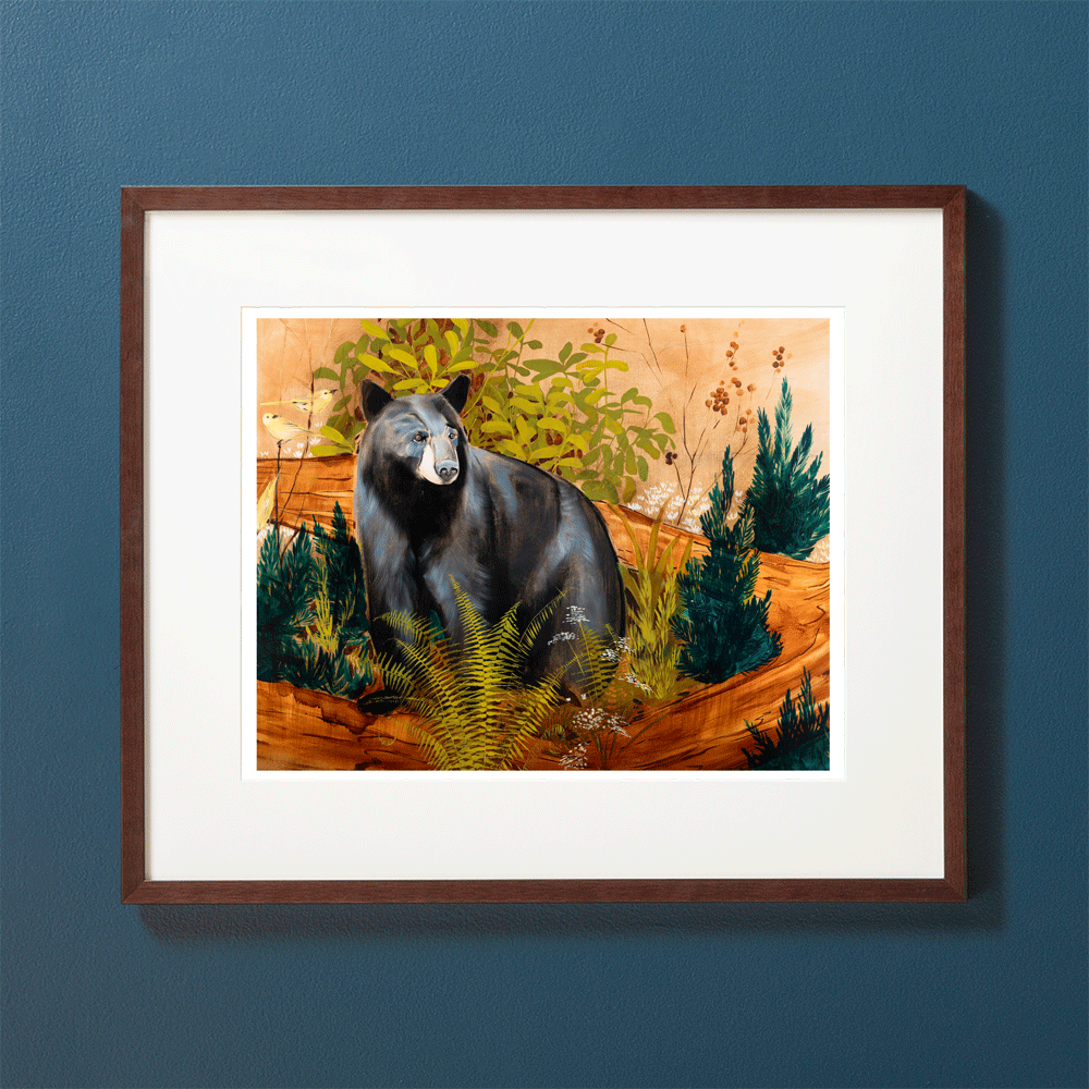 Archival Print of "Paris Mountain Bear"by Joseph Bradley - Features a Black Bear of Paris Mountain next to an old log with Ferns & Flora. This artwork is printed on fine quality matte paper with beautifully saturated archival inks. Colors are meticulously adjusted to reflect the precise color of the original paintings. This print is hand-signed by the artist and is of a limited edition of 200.